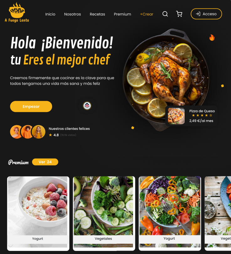 A Fuego Lento, trabajo igcongnito de mi compañero Jose Maria, donde se realizo un prototipo de su proyecto (afuegolento.com) es una web española de gastronomía donde usuarios publican recetas, interactúan y se posicionan como chefs casero.